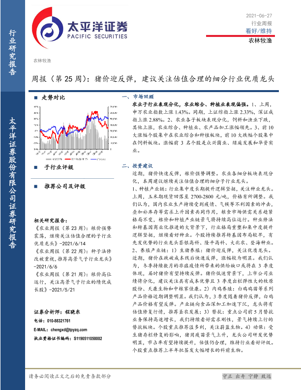 【太平洋证券】【20210627】20210627-太平洋-农林牧渔周报(第25周):猪价迎反弹,建议关注估值合理的细分行业优质龙头-15页