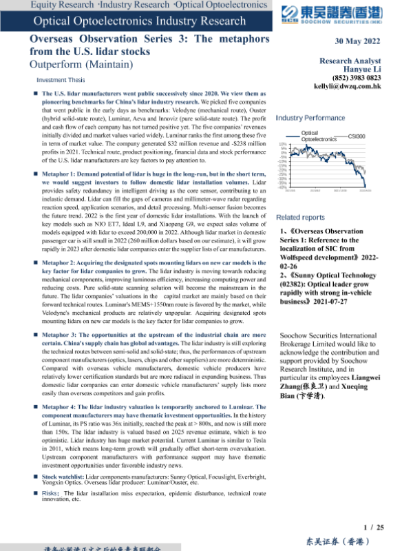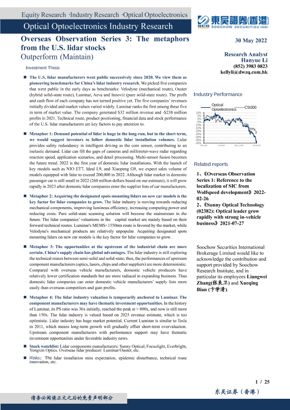 【东吴证券(香港)】【20220530】光学光电子行业深度:海外观察系列三,美股激光雷达隐喻-25页