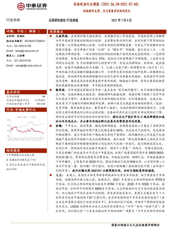 【中泰证券】【20210704】20210704-中泰证券-农林牧渔行业周报:短期猪价反弹,关注畜禽存栏结构变化-15页