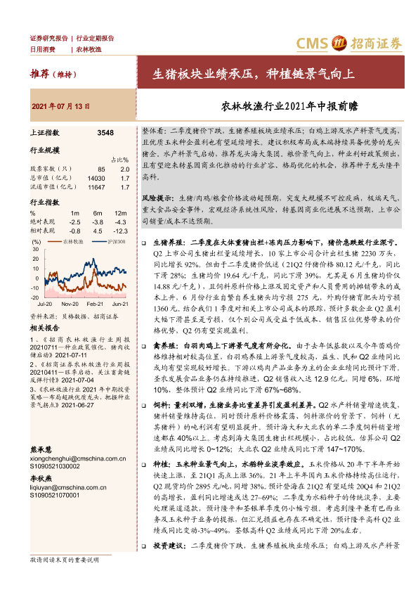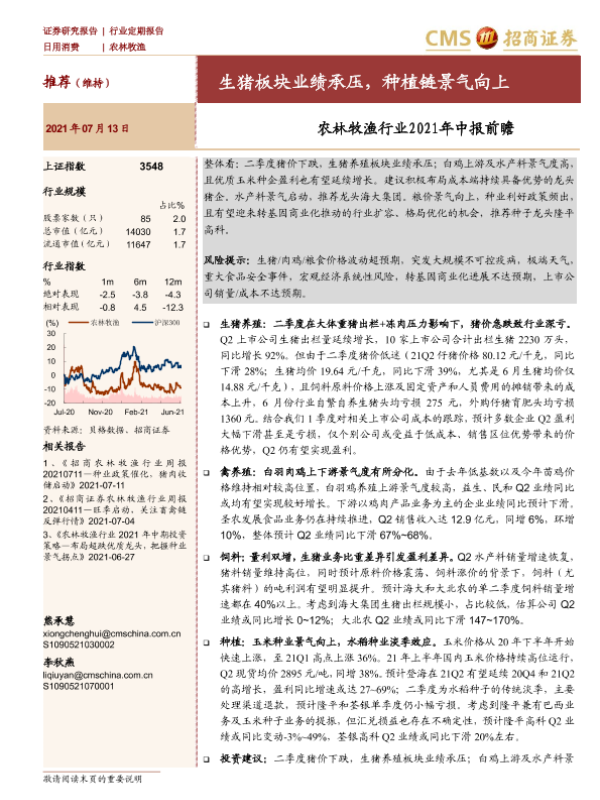 【海通证券】【20210713】农林牧渔行业2021年中报前瞻:生猪板块业绩承压,种植链景气向上-7页