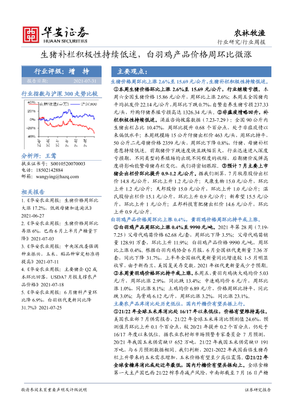 【华安证券】【20210731】20210731-华安证券-农林牧渔行业周报:生猪补栏积极性持续低迷,白羽鸡产品价格周环比微涨-41页
