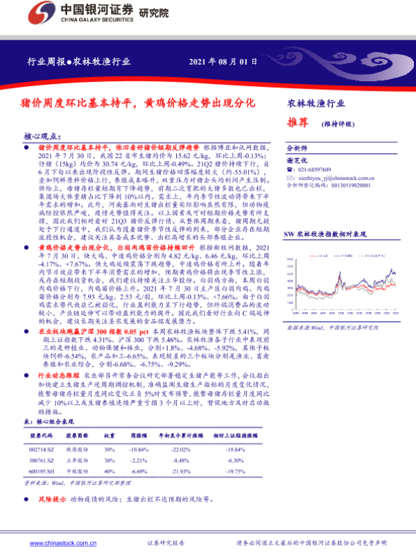 【银河证券】【20210801】20210801-中国银河-农林牧渔行业周报:猪价周度环比基本持平,黄鸡价格走势出现分化-19页