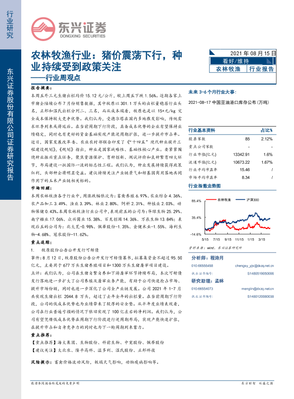 【东兴证券】【20210815】20210815-东兴证券-农林牧渔行业周观点:猪价震荡下行,种业持续受到政策关注-13页