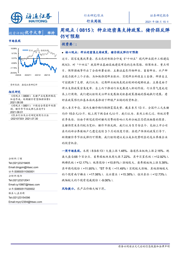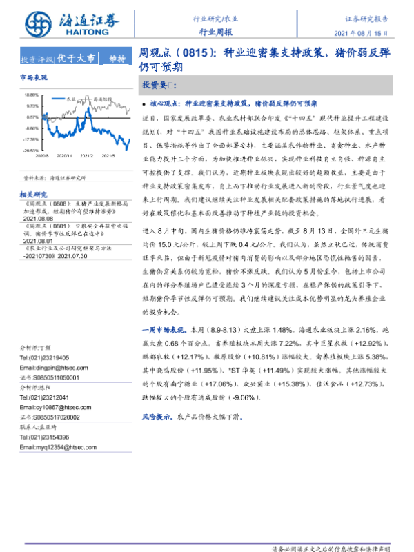 【海通证券】【20210815】20210815-海通证券-农业周观点:种业迎密集支持政策,猪价弱反弹仍可预期-3页
