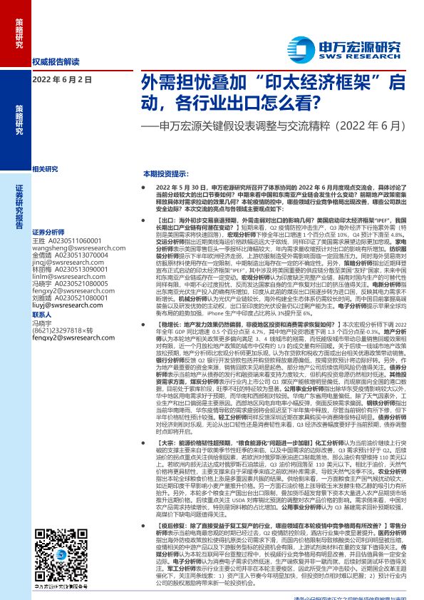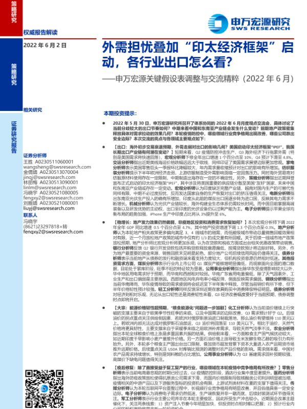 【申万宏源】【20220602】关键假设表调整与交流精粹(2022年6月):外需担忧叠加“印太经济框架”启动,各行业出口怎么看?-24页
