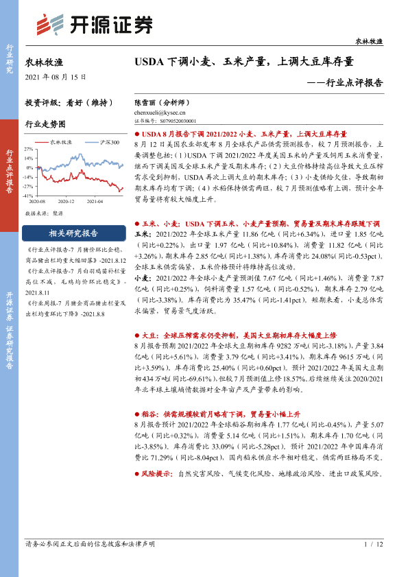 【开源证券】【20210815】农林牧渔行业点评报告:USDA下调小麦、玉米产量,上调大豆库存量-12页