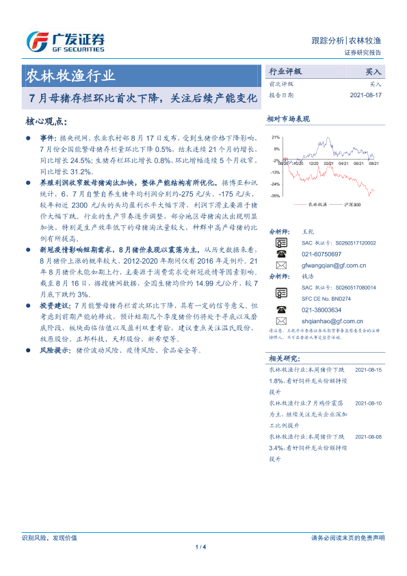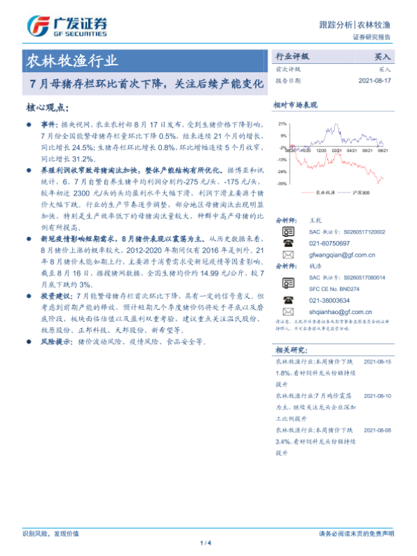 【广发证券】【20210817】20210817-广发证券-农林牧渔行业:7月母猪存栏环比首次下降,关注后续产能变化-4页