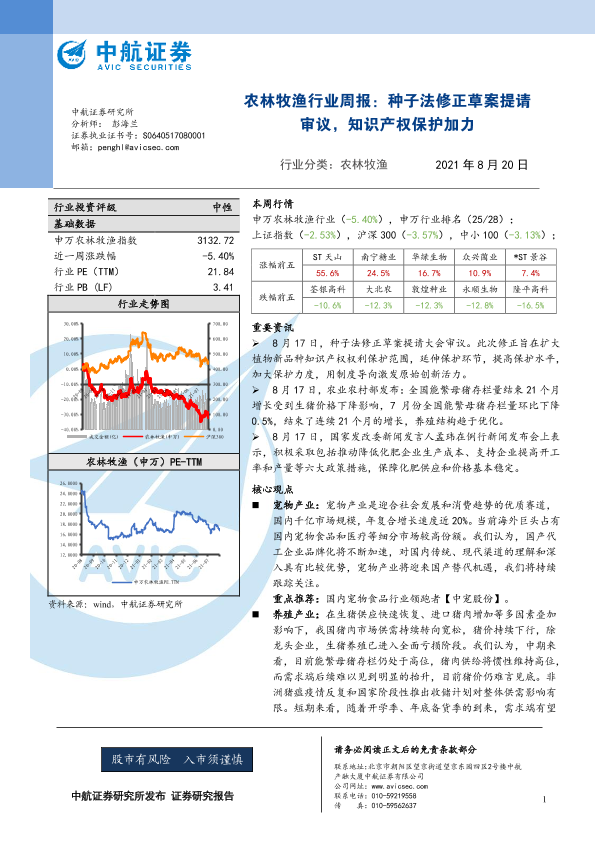【中航证券】【20210820】农林牧渔行业周报:种子法修正草案提请审议,知识产权保护加力-10页