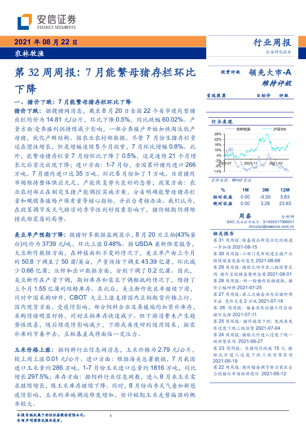 【安信证券】【20210822】20210822-安信证券-农林牧渔第32周周报:7月能繁母猪存栏环比下降-18页