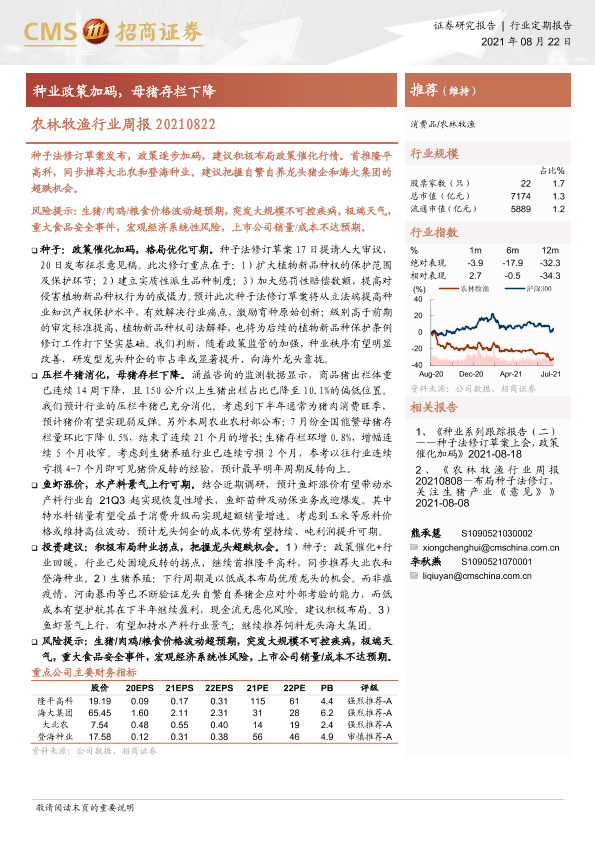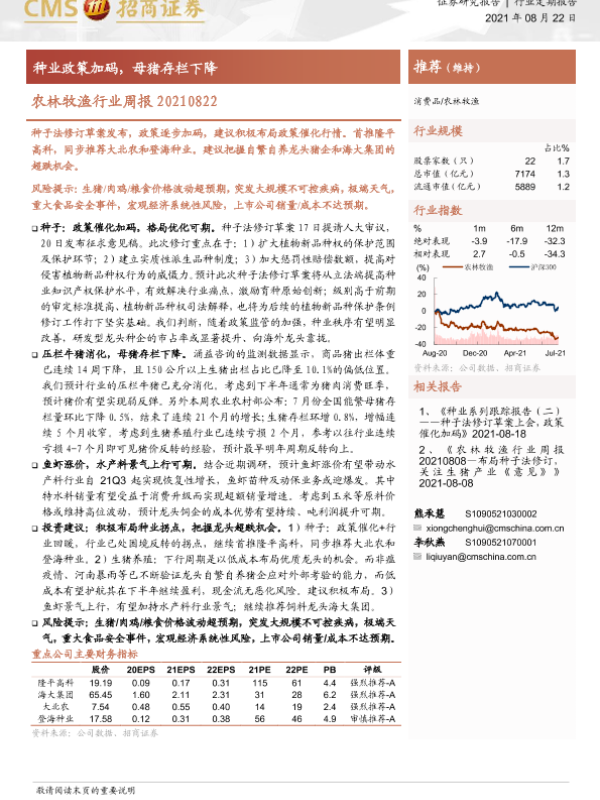 【海通证券】【20210822】农林牧渔行业周报:种业政策加码,母猪存栏下降-10页