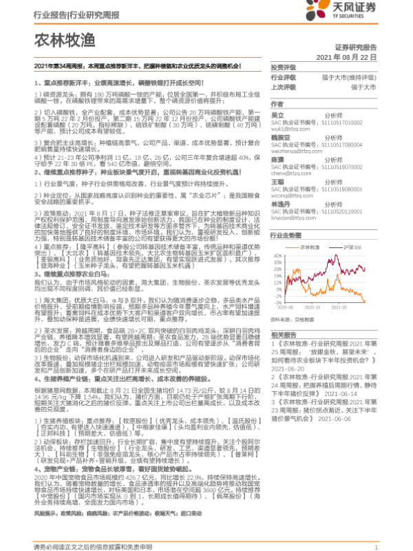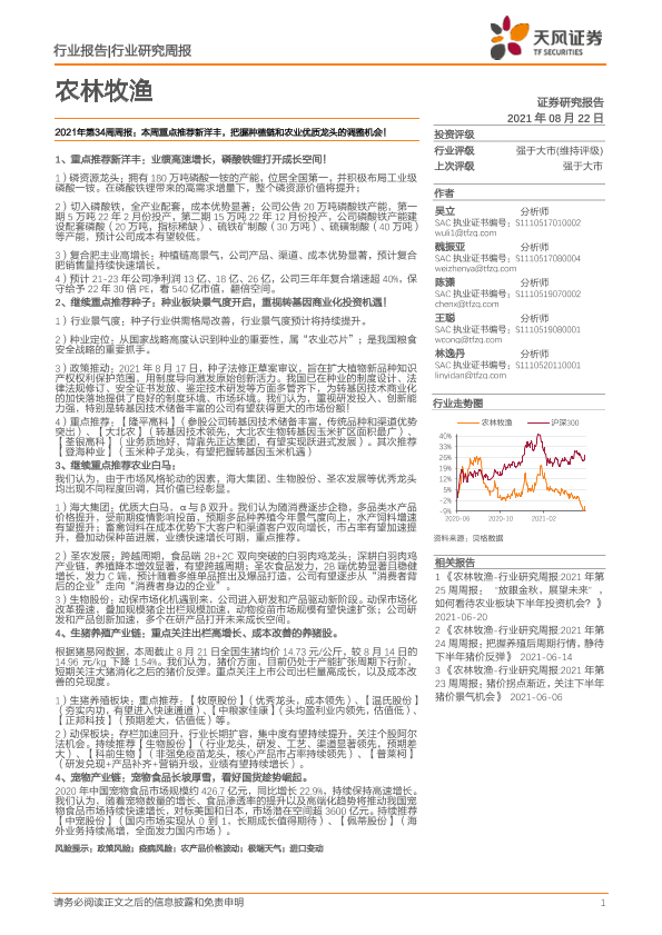 【天风证券】【20210822】农林牧渔2021年第34周周报:本周重点推荐新洋丰,把握种植链和农业优质龙头的调整机会!-14页