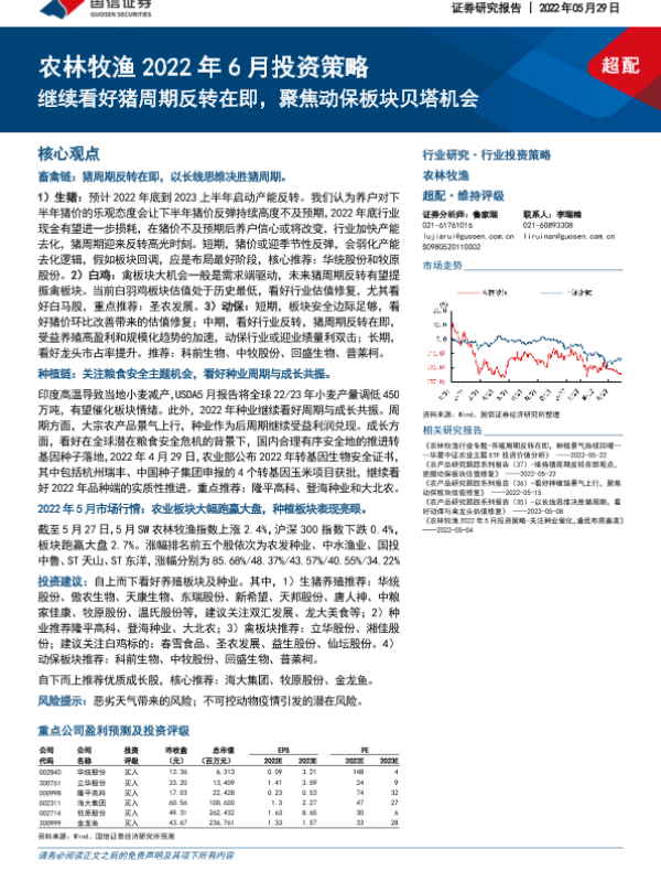 【国信证券】【20220529】农林牧渔行业2022年6月投资策略:继续看好猪周期反转在即,聚焦动保板块贝塔机会-30页