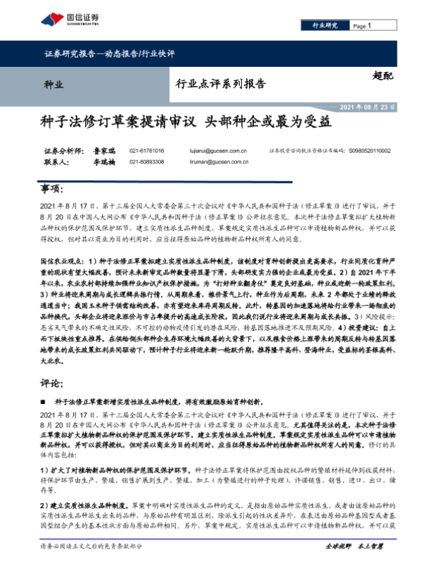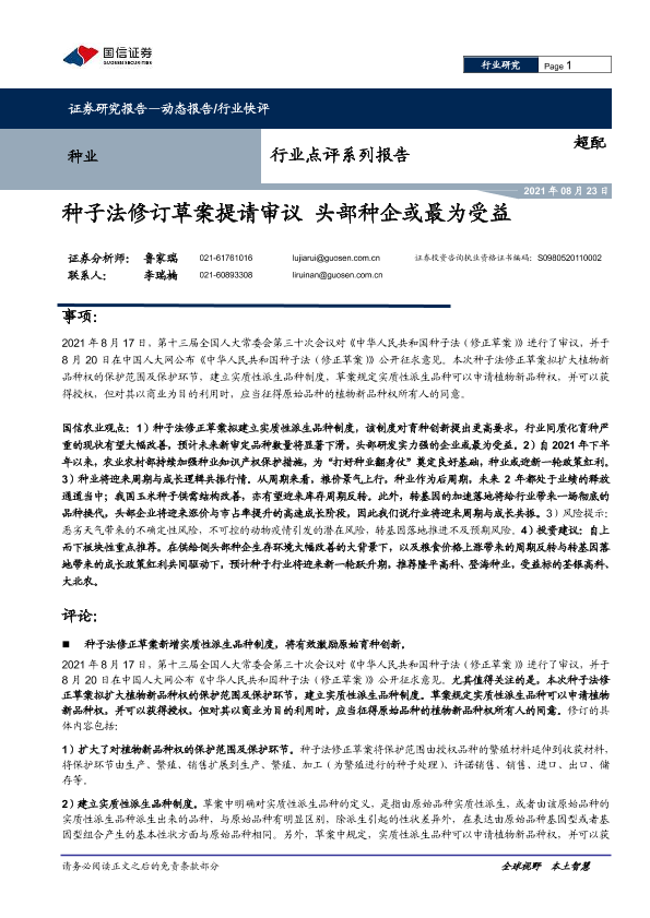 【国信证券】【20210823】种业行业点评系列报告:种子法修订草案提请审议 头部种企或最为受益-6页