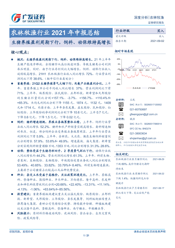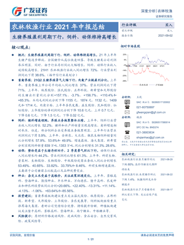 【广发证券】【20210902】农林牧渔行业2021年中报总结:生猪养殖盈利周期下行,饲料、动保维持高增长-21页