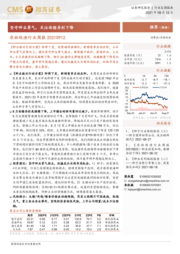 【海通证券】【20210912】农林牧渔行业周报:坚守种业景气,关注母猪存栏下降-8页