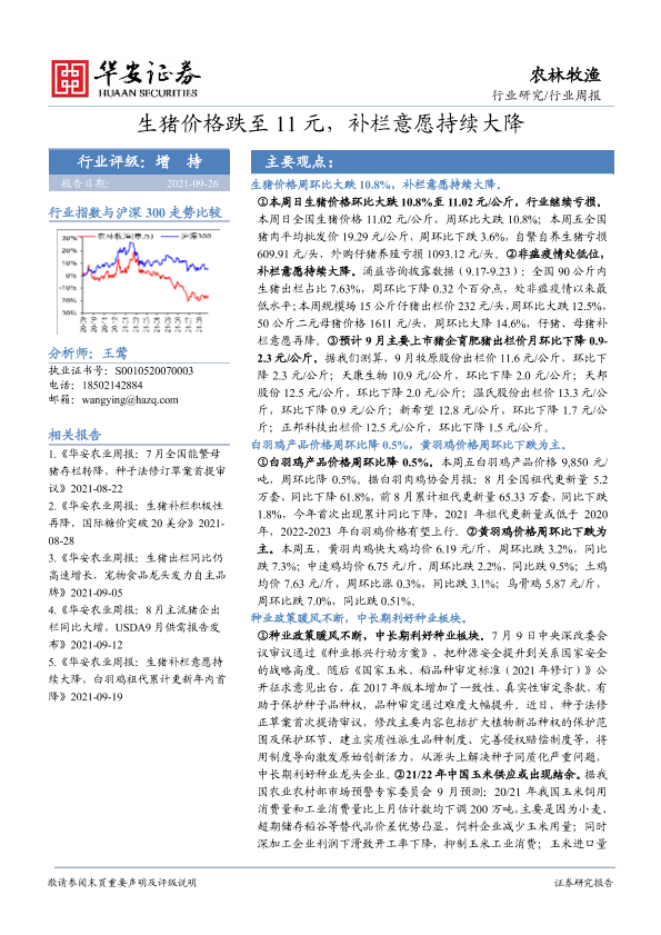 【华安证券】【20210926】20210926-华安证券-农林牧渔行业周报:生猪价格跌至11元,补栏意愿持续大降-38页