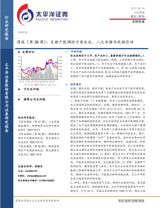 【太平洋证券】【20210926】20210926-太平洋-农林牧渔周报(第38周):生猪产能调控方案出台,二次冻猪肉收储启动-15页
