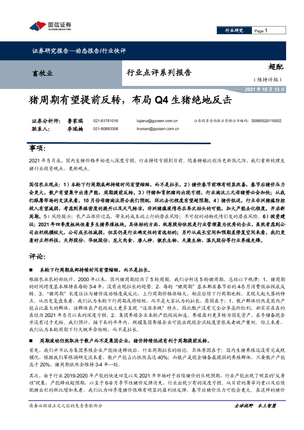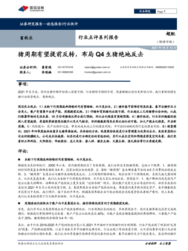 【国信证券】【20211013】畜牧业行业点评系列报告:猪周期有望提前反转,布局Q4生猪绝地反击-5页