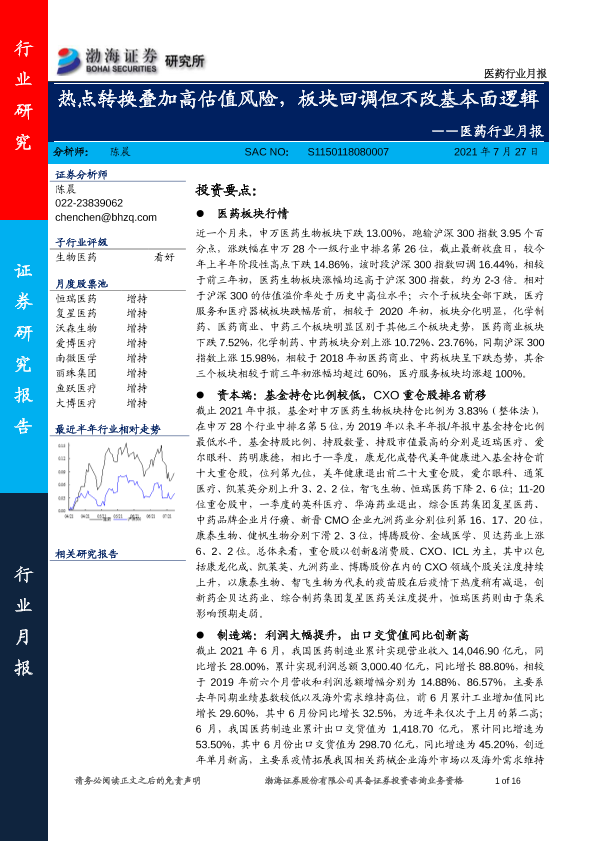 【渤海证券】【20210727】医药行业月报:热点转换叠加高估值风险,板块回调但不改基本面逻辑-16页