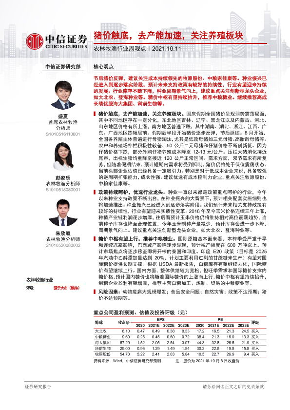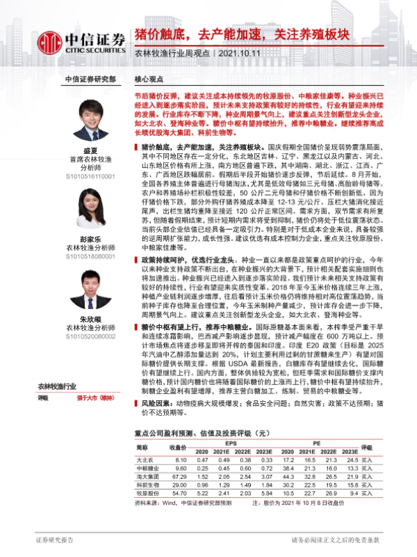 【中信证券】【20211011】20211011-中信证券-农林牧渔行业周观点:猪价触底,去产能加速,关注养殖板块-8页