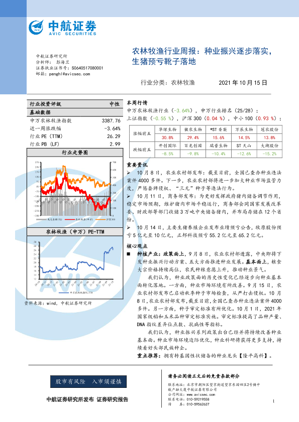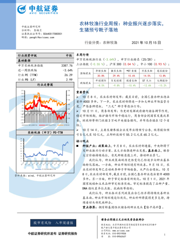 【中航证券】【20211015】农林牧渔行业周报:种业振兴逐步落实,生猪预亏靴子落地-10页
