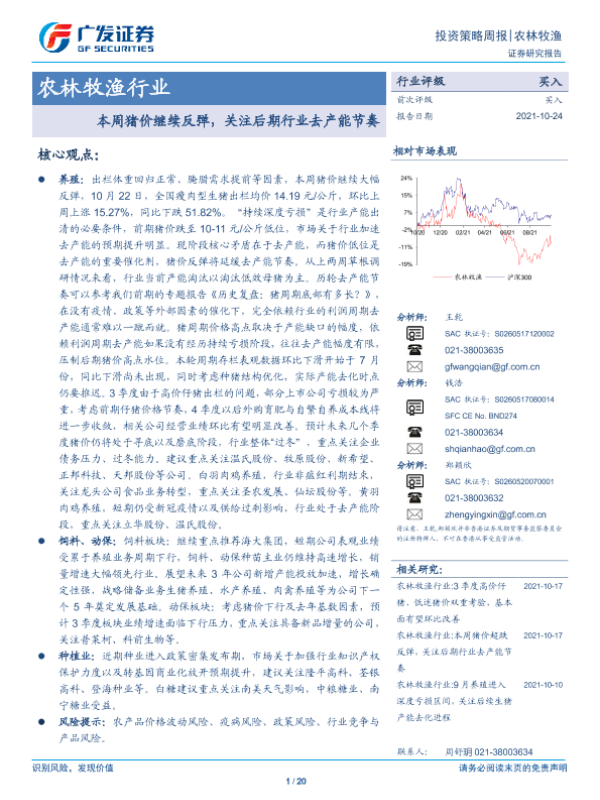 【广发证券】【20211024】20211024-广发证券-农林牧渔行业:本周猪价继续反弹,关注后期行业去产能节奏-20页