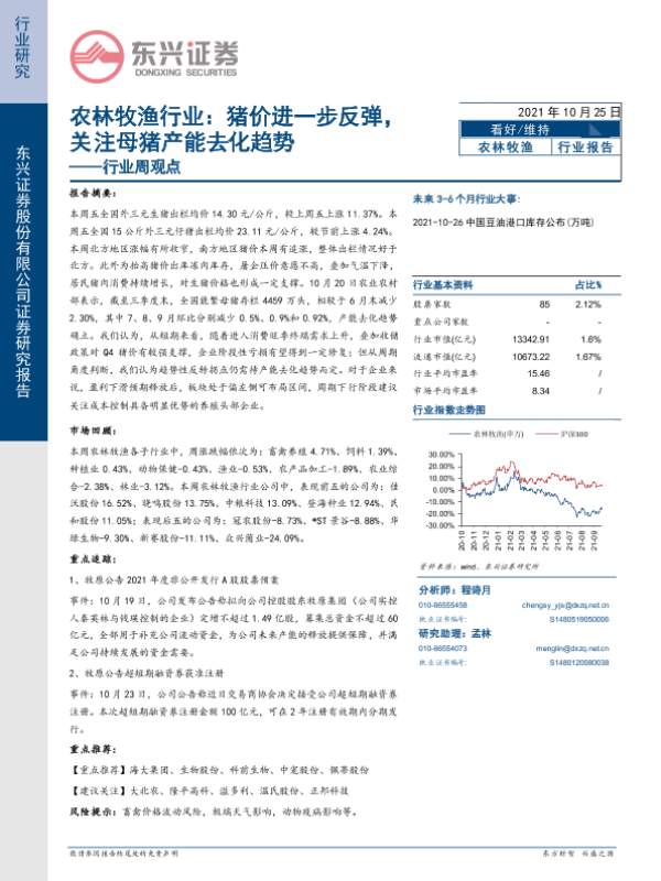 【东兴证券】【20211025】20211025-东兴证券-农林牧渔行业周观点:猪价进一步反弹,关注母猪产能去化趋势-13页