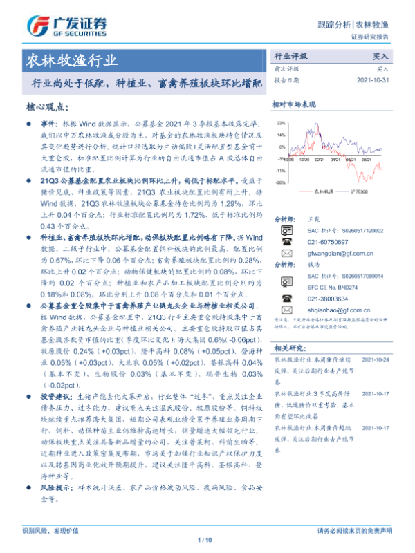 【广发证券】【20211031】农林牧渔行业:行业尚处于低配,种植业、畜禽养殖板块环比增配-10页