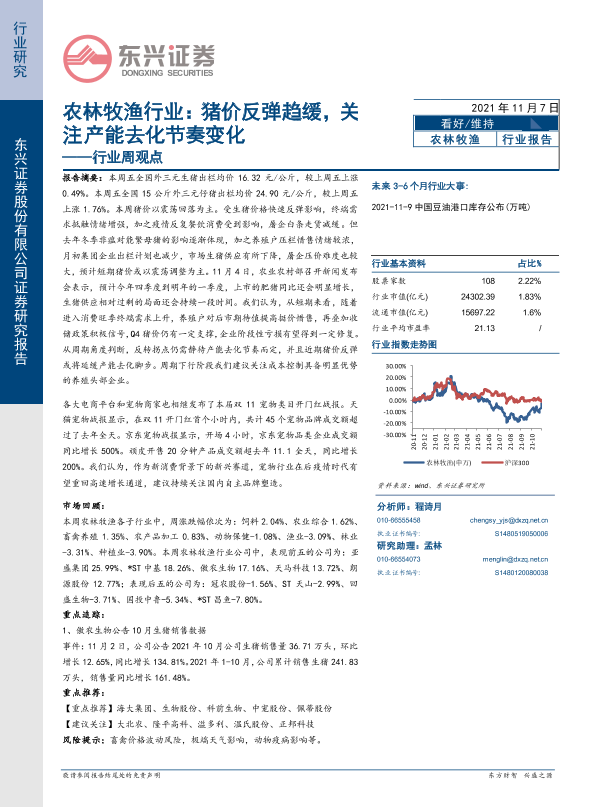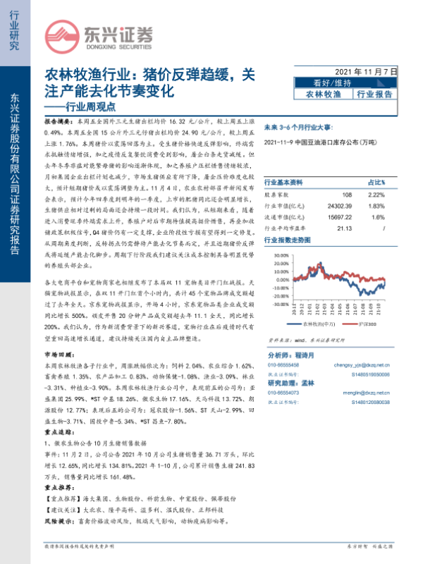 【东兴证券】【20211107】20211107-东兴证券-农林牧渔行业周观点:猪价反弹趋缓,关注产能去化节奏变化-13页