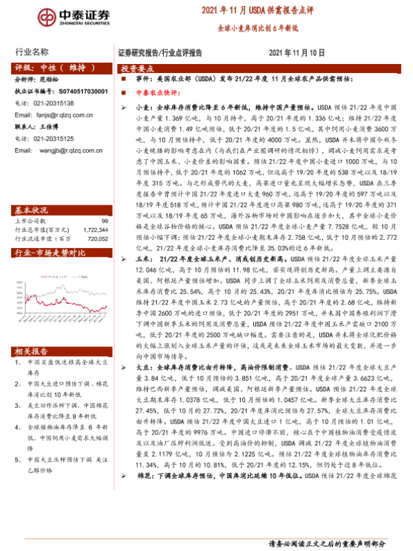 【中泰证券】【20211110】农业2021年11月USDA供需报告点评:全球小麦库消比创6年新低-11页
