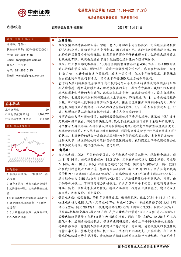 【中泰证券】【20211121】20211121-中泰证券-农林牧渔行业周报:粮价走高驱动猪价抬升,重视黄鸡行情-17页