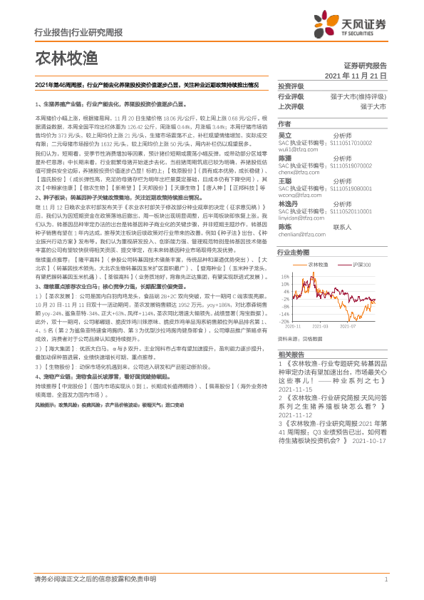 【天风证券】【20211121】农林牧渔2021年第46周周报:行业产能去化养猪股投资价值逐步凸显,关注种业近期政策持续推出情况-14页