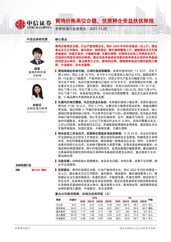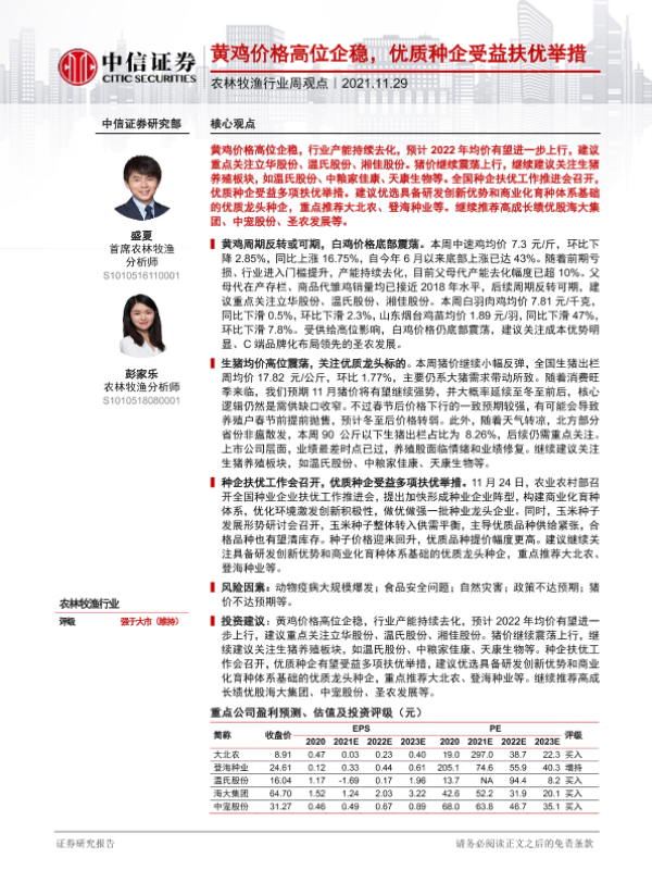 【中信证券】【20211129】20211129-中信证券-农林牧渔行业周观点:黄鸡价格高位企稳,优质种企受益扶优举措-14页