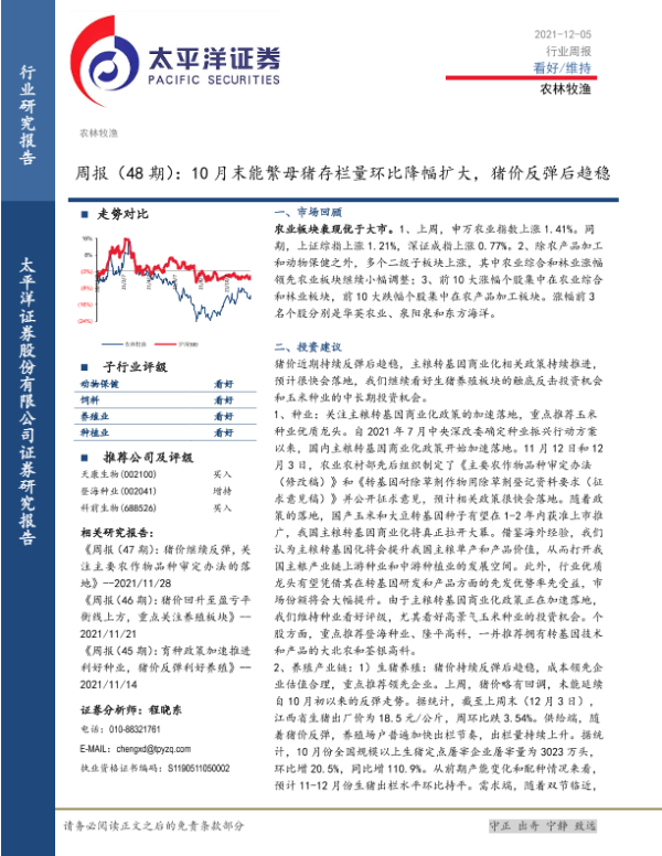 【太平洋证券】【20211205】20211205-太平洋-农林牧渔周报(48期):10月末能繁母猪存栏量环比降幅扩大,猪价反弹后趋稳-15页