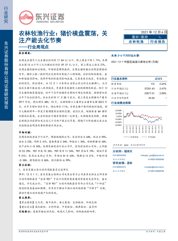 【东兴证券】【20211206】20211206-东兴证券-农林牧渔行业周观点:猪价横盘震荡,关注产能去化节奏-14页