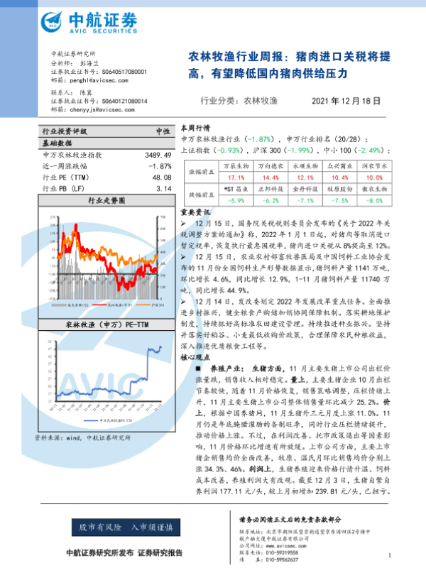 【中航证券】【20211218】农林牧渔行业周报:猪肉进口关税将提高,有望降低国内猪肉供给压力-11页