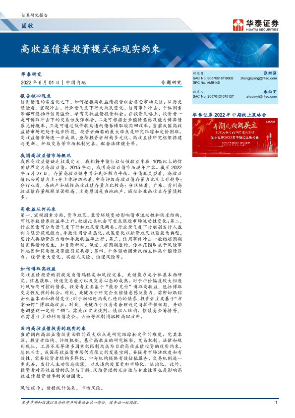 【华泰证券】【20220601】固收专题研究:高收益债券投资模式和现实约束-26页