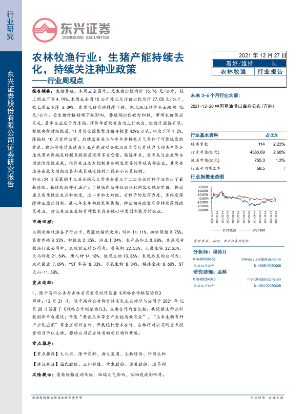 【东兴证券】【20211227】农林牧渔行业:生猪产能持续去化,持续关注种业政策-13页
