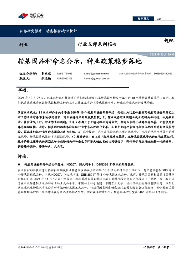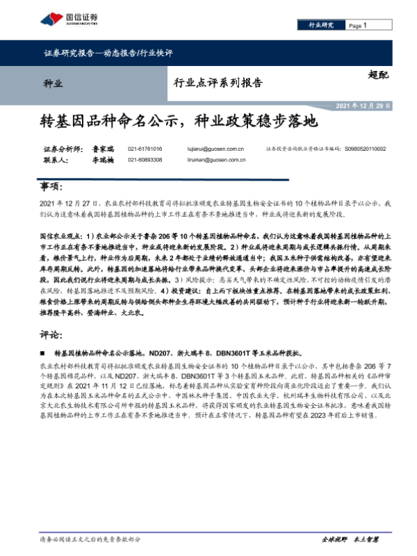 【国信证券】【20211229】种业:转基因品种命名公示,种业政策稳步落地-7页