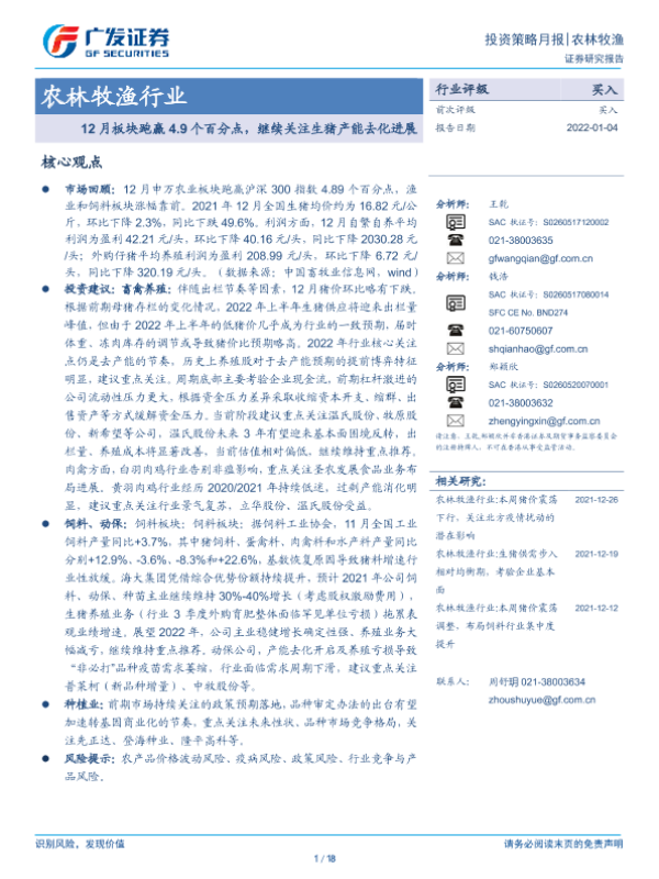 【广发证券】【20220104】20220104-广发证券-农林牧渔行业投资策略月报:12月板块跑赢4.9个百分点,继续关注生猪产能去化进展-18页