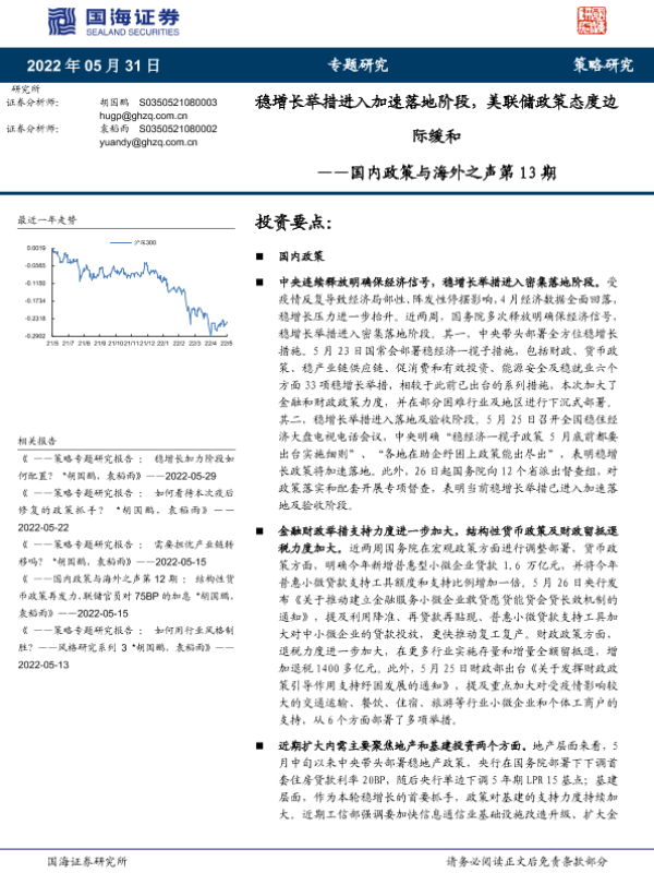 【国海证券】【20220531】国内政策与海外之声第13期:稳增长举措进入加速落地阶段,美联储政策态度边际缓和-26页