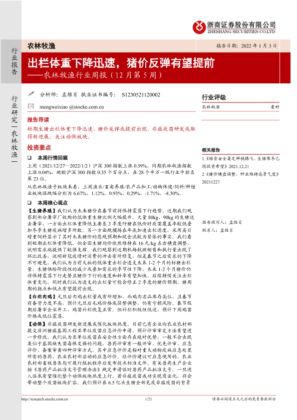 【浙商证券】【20220103】农林牧渔行业周报(12月第5周):出栏体重下降迅速,猪价反弹有望提前-21页