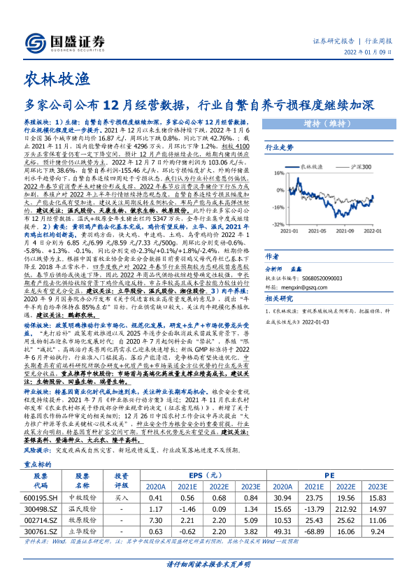 【国盛证券】【20220109】农林牧渔:多家公司公布12月经营数据,行业自繁自养亏损程度继续加深-16页