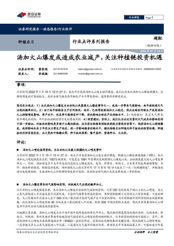 【国信证券】【20220119】种植业Ⅱ行业点评系列报告:汤加火山爆发或造成农业减产,关注种植链投资机遇-5页