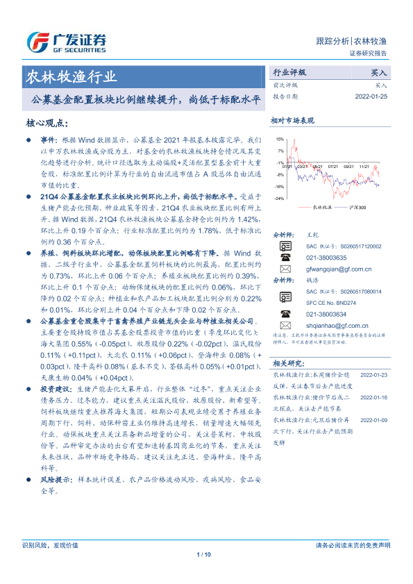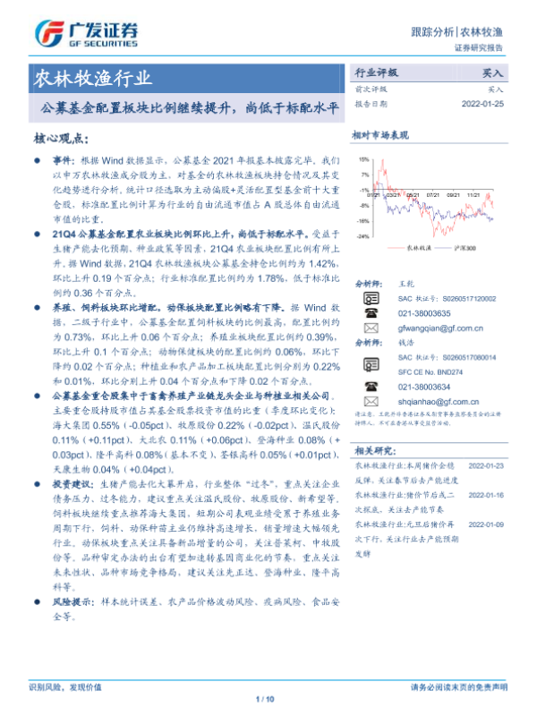 【广发证券】【20220125】20220125-广发证券-农林牧渔行业跟踪分析:公募基金配置板块比例继续提升,尚低于标配水平-10页