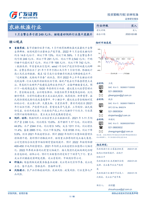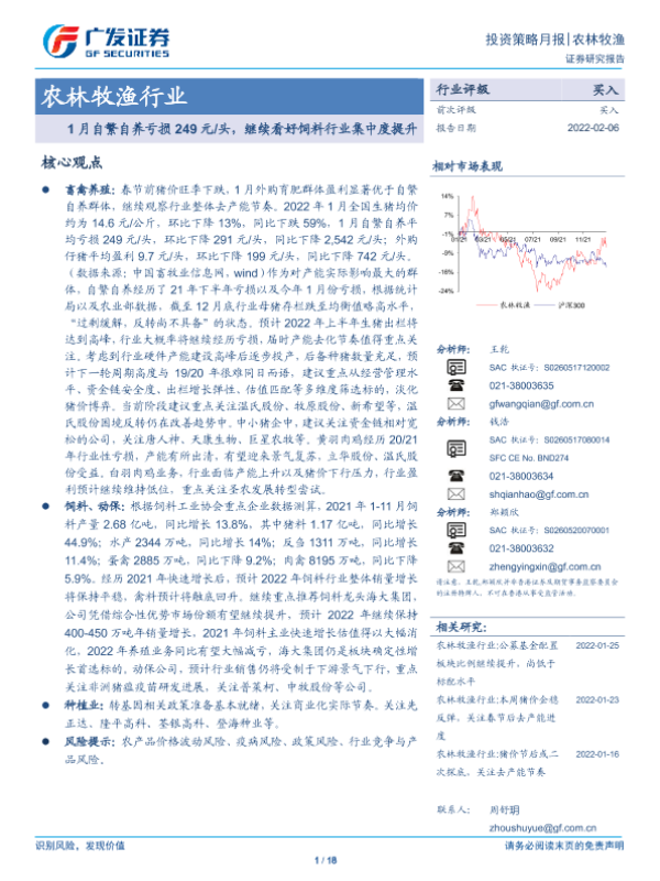 【广发证券】【20220206】20220206-广发证券-农林牧渔行业投资策略月报:1月自繁自养亏损249元 头,继续看好饲料行业集中度提升-18页