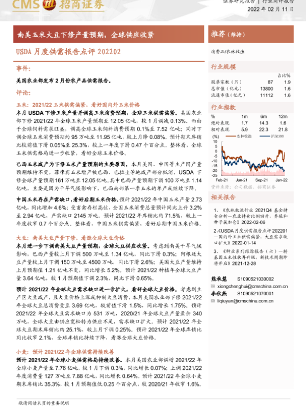 【海通证券】【20220211】农林牧渔:USDA月度供需报告点评-南美玉米大豆下修产量预期,全球供应收紧-4页