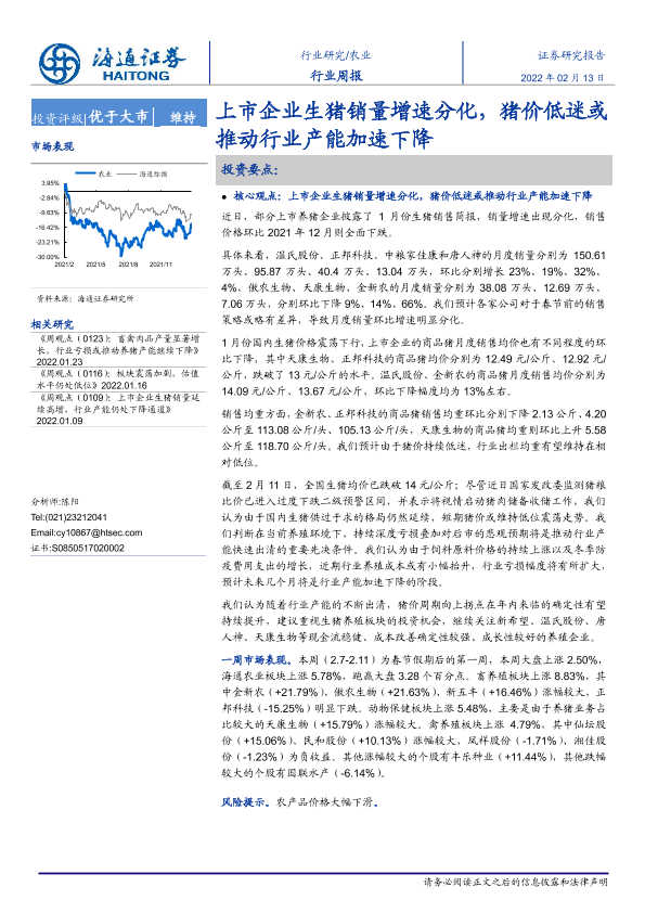 【海通证券】【20220213】20220213-海通证券-农业行业周报:上市企业生猪销量增速分化,猪价低迷或推动行业产能加速下降-4页