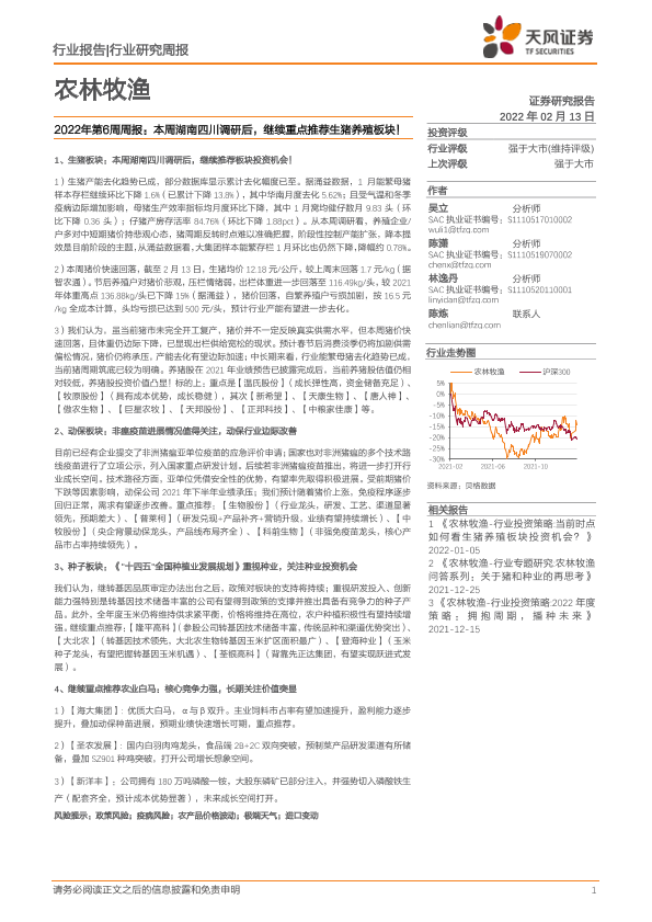 【天风证券】【20220213】2022年第6周周报:本周湖南四川调研后,继续重点推荐生猪养殖板块!-14页