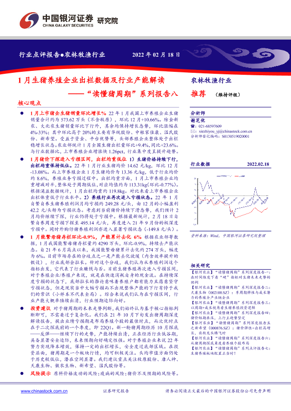 【银河证券】【20220218】“读懂猪周期”系列报告八:1月生猪养殖企业出栏数据及行业产能解读-8页